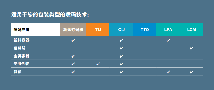 基于墨水的非接触式喷印技术,适合多种大尺寸数据类型(字母数字、徽标和条码),主要用于货箱等二级包装。
