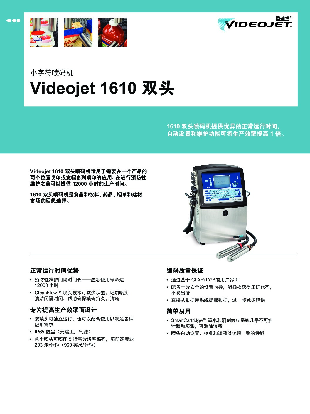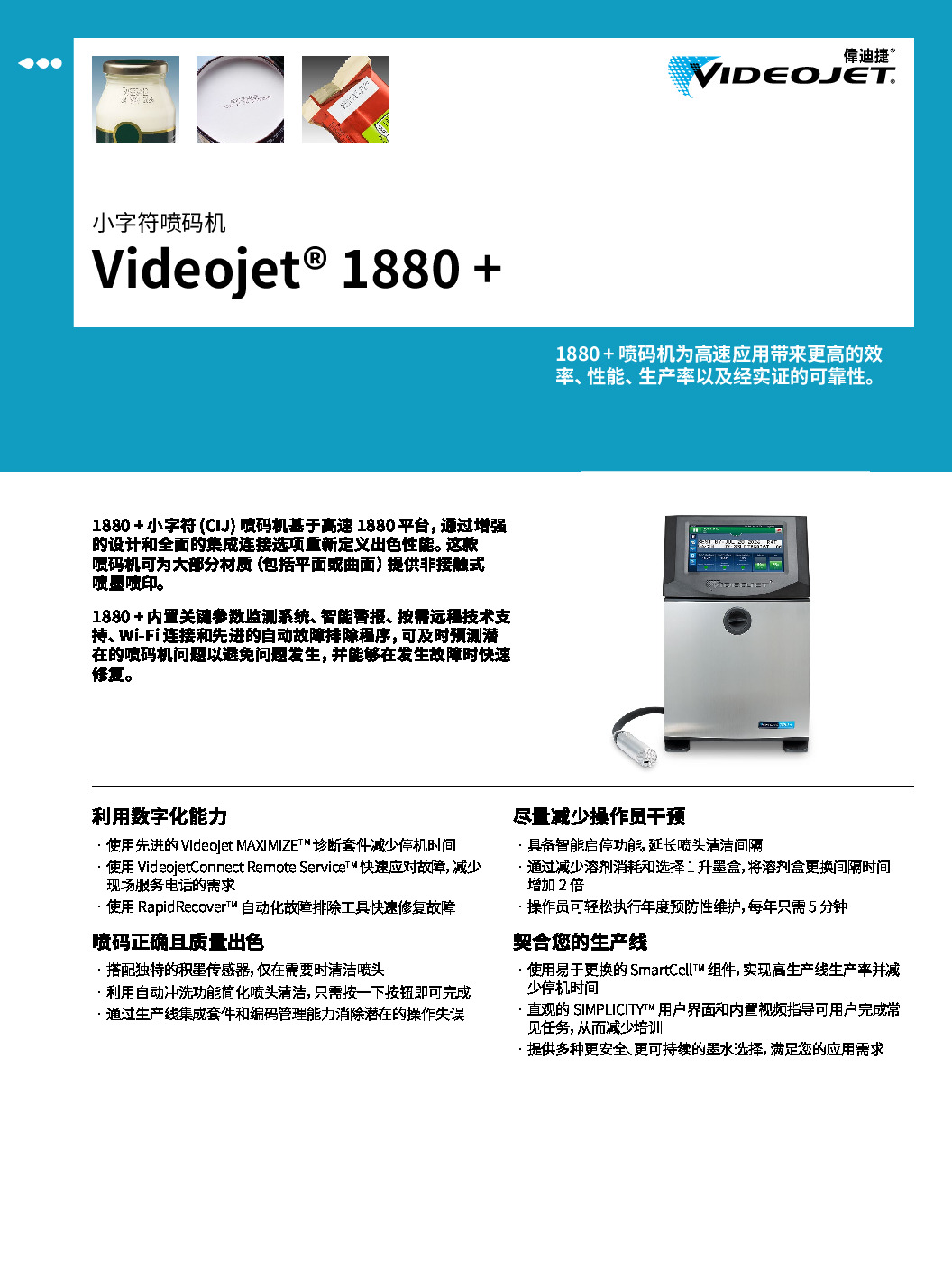 使用基于墨水和溶剂的非接触式喷印技术,可以在各种类型的包装上喷印多达 5 行文本,一维码、二维码和图形。同时也可以通过横向往返运动系统在静态包装上进行喷印。