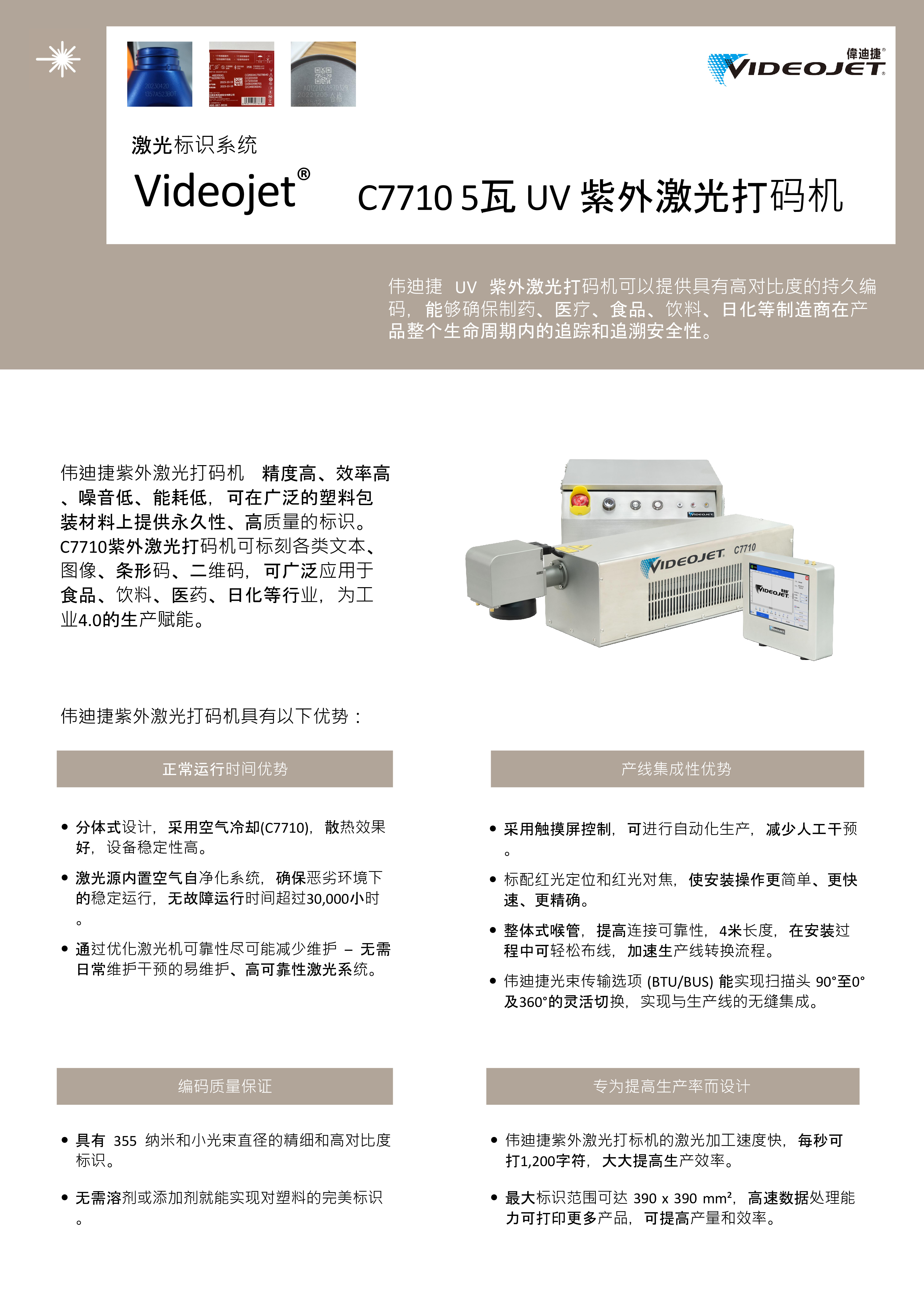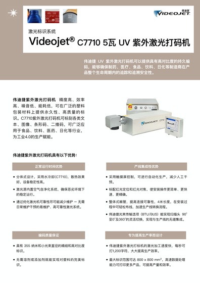 伟迪捷Videojet C7710紫外激光打码机可以提供具有高对比度的持久编码,能够确保制药、医疗、食品、饮料、日化等制造商在产品整个生命周期内的追踪和追溯安全性。