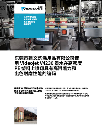 东莞市建文洗涤用品有限公司使 用 Videojet V4230 墨水在高密度 PE 塑料上喷印具有高附着力和 出色耐磨性能的编码