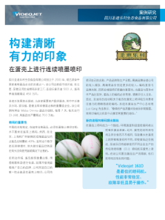 喷印自己的名称、产品品种和生产日期。高端品牌会使公司 的收入增加,高端商品会创造更多的收入。编码直接与 品牌关联,因而会增强喷印质量的重要性。当蛋品与竞争对 手产品比较时,蛋品上的编码必须亮丽、清晰并引人注目。 因此,圣迪乐的成功取决于能否在蛋壳上喷印吸引消费者 注意力的清晰易读的编码。圣迪乐蛋品生产中心总经理 Luo Gang 先生表示,“整体的产品质量对圣迪乐非常重要。 而喷印编码又在其中占据非常重要的地位。”