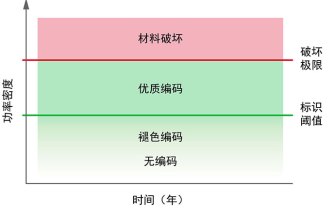 低于标识阈值的功率密度可能导致编码弱化或褪色,然而,功率密度 过度提高可能会超出所述第二阈值(破坏极限),从而可能损坏材 料。只有施加适量的功率密度,才能标识出一致的、高对比度的编 码。