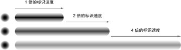 激光打码机发出的功率在一个区域上分布成一条线。如果该标识速 度加倍,则在同一时间激光束所覆盖的范围也将加倍。因此,功率 密度会降低到一半。同样,如果该标识速度提高了四倍,功率密度 会降低到四分之一。