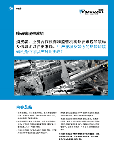 本白皮书详细说明了整个喷码流程中的关键因素,以及 如何改进这些因素,从而达到提高生产率、减少浪费、 降低成本和加强风险管理的目的。
