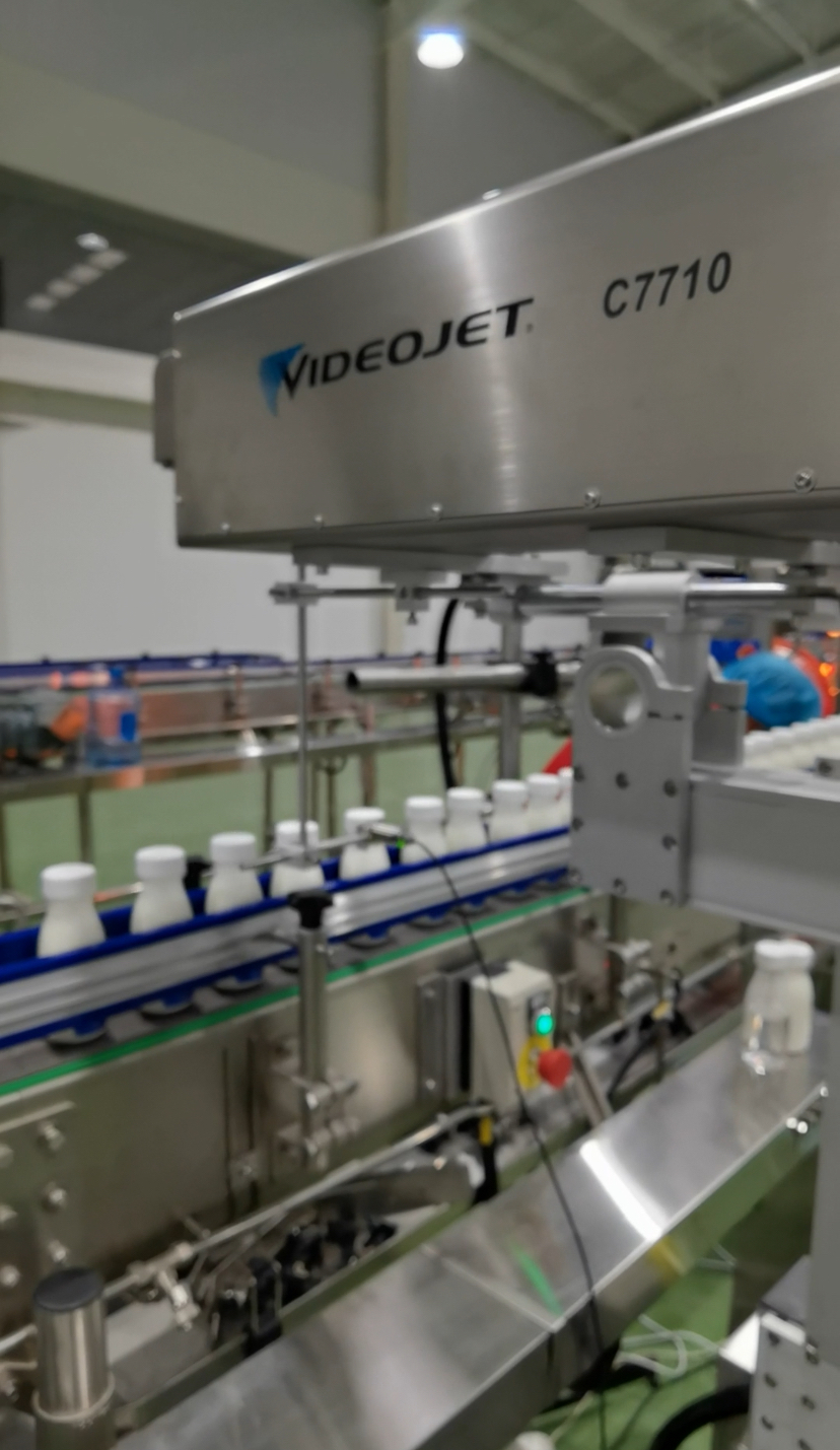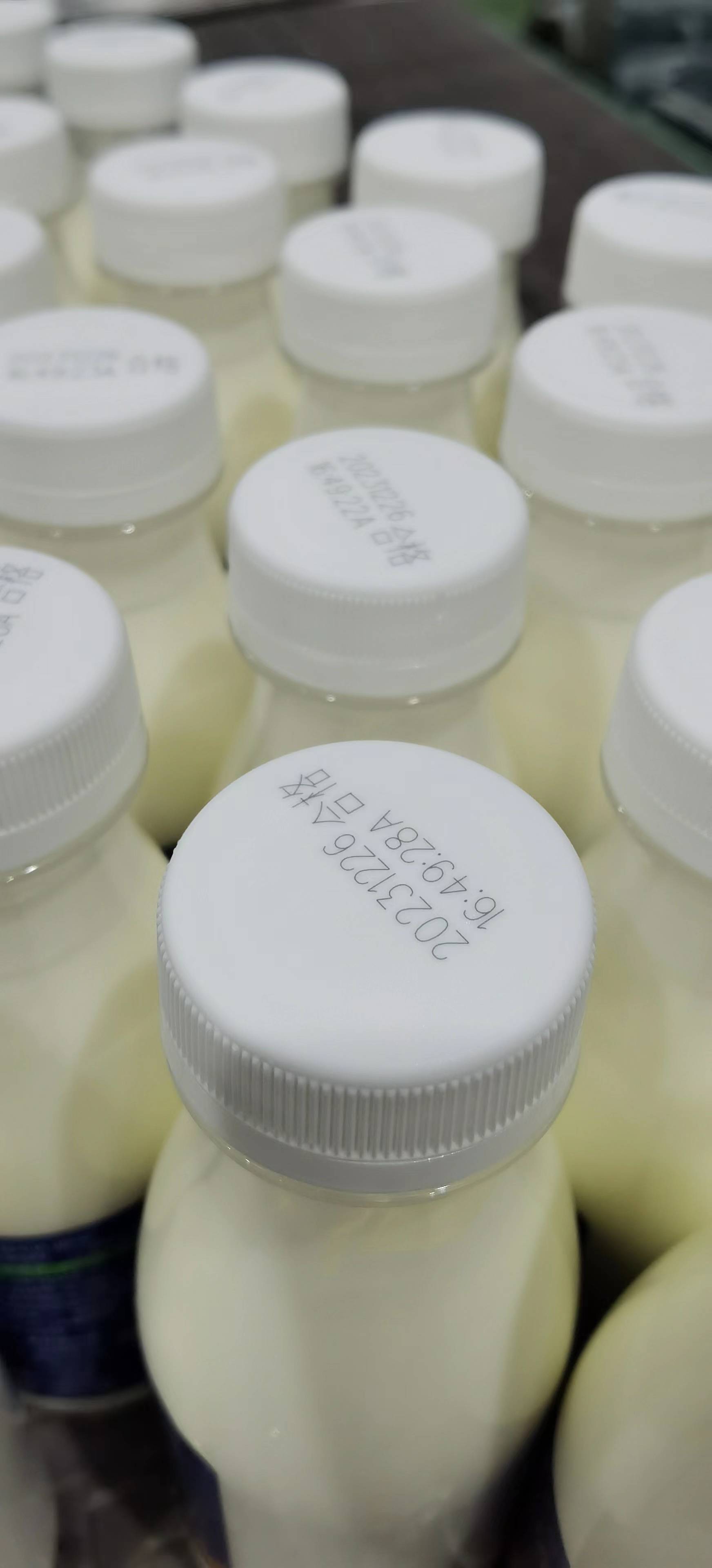 该客户是乳制品生产企业,在瓶装乳制品的白色PE瓶盖上打印生产日期,要求每小时4000瓶的产线速度。